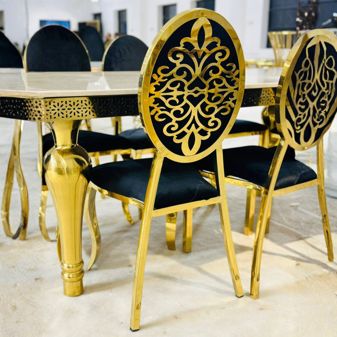 Add a touch of elegance and sophistication to your space with this Luxury Black & Gold Accent Chair. Designed to make a bold statement, this chair features a sleek black upholstered seat and backrest beautifully contrasted by a polished gold metal frame. Its unique curved silhouette and glossy finish bring a modern, upscale look to dining rooms, lounges, hotels, restaurants, and event spaces.